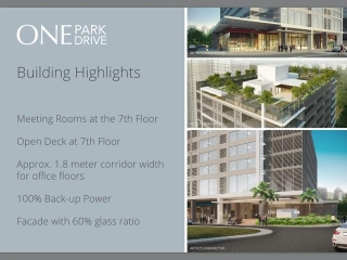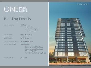 Business owners may choose from 65 to 150 sqm units, hold big meetings at the 7th floor, and entertain valued clients at the open roof deck. They will also appreciate how the building was planned, from its attractive façade, lobby, to its generous hallways. Shops at the ground floor and the nearby park altogether make the experience of doing business in One Park Drive unique.